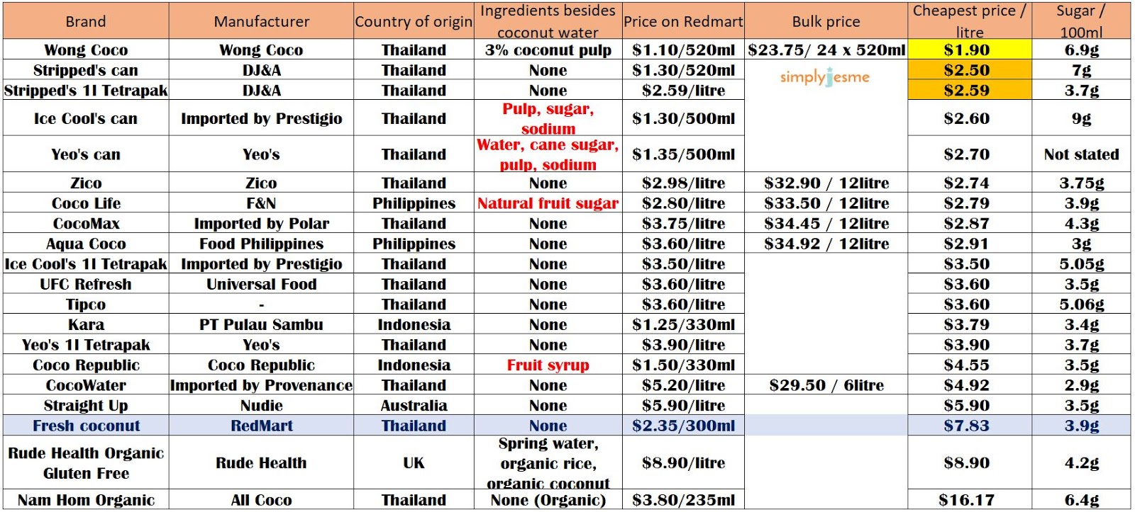 4) Many pre-packed coconut water has a higher sugar content not because they have secretly added sugar to it. Most time it is because a very concentrated form of coconut water is used, resulting in higher sugar levels per serving.
